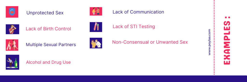 Alcohol and Drug Use: Engaging in sexual activity under the influence of alcohol or drugs, which may impair judgment and lead to risky sexual behaviors.